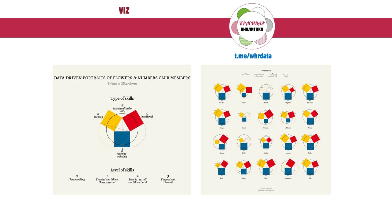 «Каждый квадрат кодирует навык, его размер — уровень владения. Навык визуализации данных, как обобщающий, я показала кругом. Его центр располагается на пересечении двух осей» - так описывает свою работу Надя сама, а еще в ее оригинальном посте есть отсылка к классике.