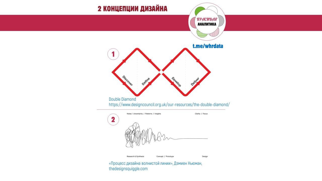 Я нагуглила 2 совершенно разные внешне схемы, которые быстро помогают объяснить процесс проектирования (дизайна) и систему создания дизайн-решения.
