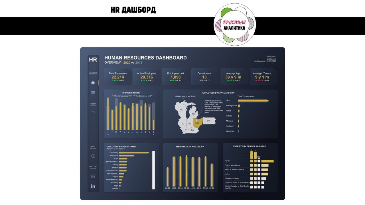 Очередной дашборд, как и большинство остальных там, на тему "соц-дем": наймы, распределение по географии, распределение по департаментам, полу и возрасту. Такого рода данные входят в обязательный отчет по персоналу.
