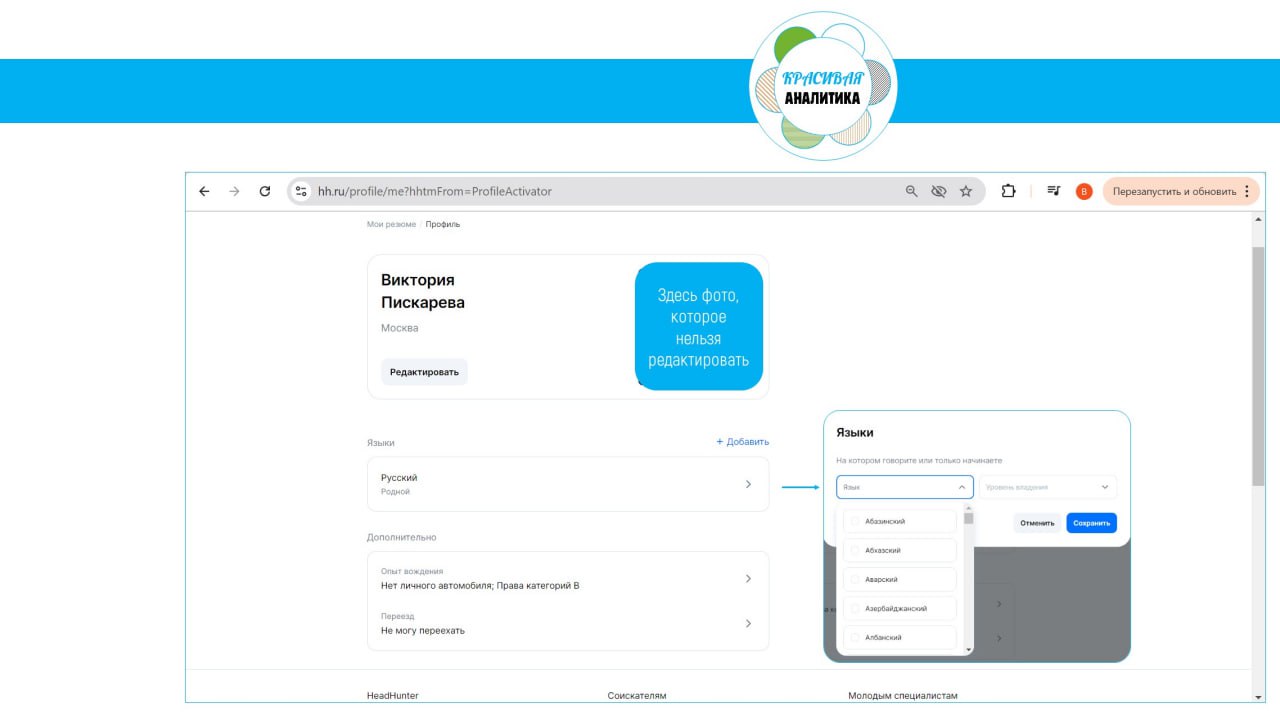 Чем это помогает искать работу я не очень поняла, но, кажется, ребята, занялись нормализацией данных и разделили витрины данных сотрудников и физлиц 😉 Но остался вопросик: а как же фото, контакты, навыки, образование (вместе с дополнительным)? Кажется, они пока в профиль не попали. Видимо, это пока в бэклоге. Ждемс.
