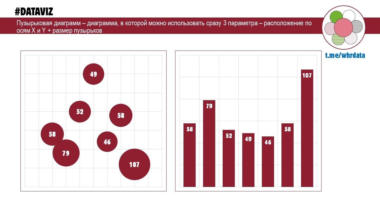 Пузырьковая диаграмма - способ визуализации сразу 3х параметров. За 2 отвечает расположение по осям Х и Y, за третий - размер круга.