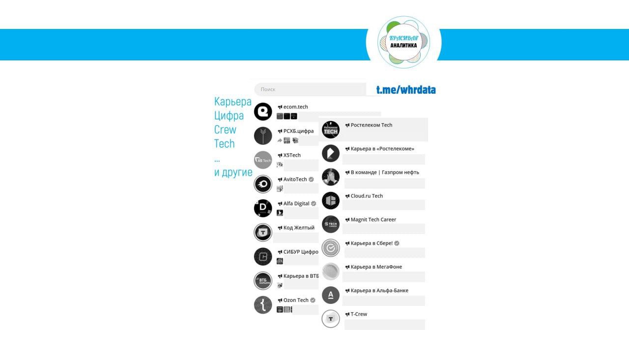 - Красивая аналитика | HR | Tech18345 подписчиков1117 постовАвторский канал Виктории Пискаревой Про HRTech продукты, автоматизацию HR процессов, аналитику, данные о людях, опыт пользователей и жизнь вокруг РКН: https://vk.cc/cHknrk за сотрудничеством к @victoria_pi или https://telega.in/c/whrdata/?r=hC2dMj5r HR